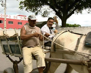 O apresentador Tom Ribeiro, da TV Cabrália/Record News deu um show de criatividade nesta quinta-feira, ao abrir o programa Alerta Total montado numa carroça.