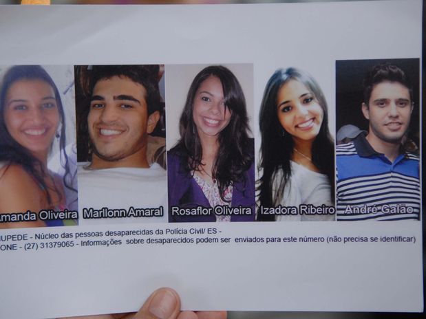 Estavam desaparecidos André Galão, 28, ex-estudante de design de moda do Centro Universitário do Espírito Santo (Unesc), Izadora Ribeiro, 21, Rosaflor Oliveira, 24, Amanda Oliveira, 22, e Marllonn Amaral, 21 –todos estudantes de biologia do Centro Universitário Norte do Espírito Santo (Ceunes). A polícia trabalha com a hipótese de acidente, mas não descarta a hipótese de homicídios motivados por vingança.