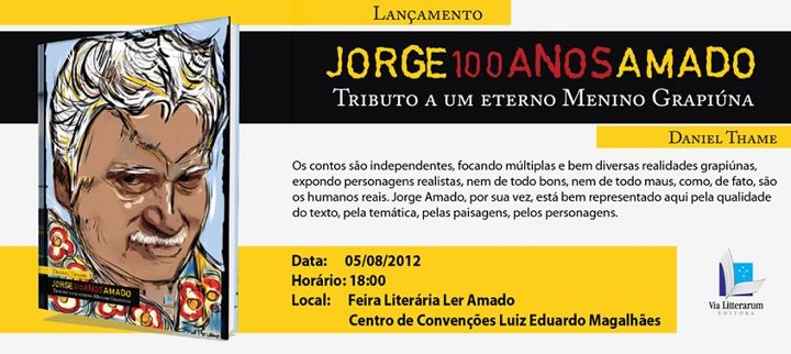 O jornalista Daniel Thame lança no próximo domingo, dia 5 de agosto, às 18 horas, no Centro de Convenções de Ilhéus, na abertura da Feira Literária Amar Amado, o livro “Jorge100anosAmado – Tributo a um eterno menino grapiuna”. Editado pela Via Litterarum, o livro é uma homenagem a Jorge Amado nas comemorações de seu centenário e está incluído na programação oficial dos 100 anos do escritor, coordenadas pela Fundação Cultural. “Jorge100anosAmado”, que tem na capa um quadro do artista ilheense Goca Moreno, traz uma série de contos que abordam a obra amadiana, Os romances de Jorge servem como referência para os contos que focam majoritariamente o universo do cacau e sua gente e incluem uma bem humorada crônica sobre a disputa entre Ilhéus e Itabuna pela ´paternidade´do escritor.
