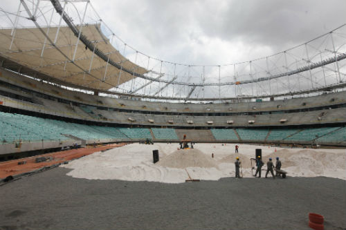 As primeiras mudas do gramado da Arena Fonte Nova começaram a ser plantadas nesta quarta-feira (16). A grama Bermuda, do tipo Celebration, vai ocupar uma área de nove mil metros quadrados. Desde a colheita até o momento do plantio, as mudas são mantidas refrigeradas a 13 graus. Se não estiver na temperatura adequada, a planta não tem uma boa aderência ao solo, por isso todo o cuidado é tomado.