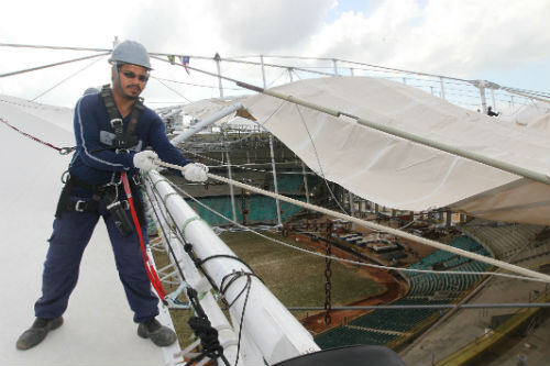 Flexível, resistente e autolimpante, a lâmina da cobertura começou a ser instalada em 13 de dezembro de 2012, mobilizando uma equipe com 75 pessoas, inclusive montadores alpinistas especializados em construção civil. O material é confeccionado em plástico de alta performance, reforçado com fibra de vidro. Testes realizados nos Estados Unidos mostraram alta resistência às correntes de vento.