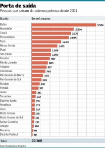 Segundo as contas oficiais, aproximadamente 22,2 milhões de pessoas deixaram a extrema pobreza desde o início do governo Dilma. A Bahia (3.524.008) foi o Estado com o maior número de beneficiados, seguida do Maranhão (2.295.502), Ceará (2.139.457), Pernambuco (2.025.347) e Pará (1.603.831).
