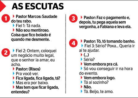 Em escutas autorizadas pela Justiça que já estão sendo investigadas pela polícia, o pastor Marcos Pereira é flagrado em conversas picantes com fiéis da Assembleia de Deus dos Últimos Dias.