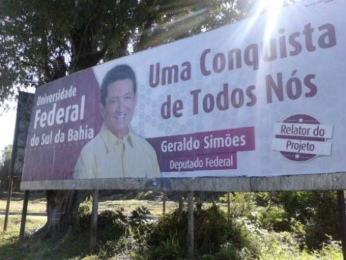 Simões espalhou outdoors destacando a implantação da Ufesba em pontos estratégicos do Sul da Bahia, centrando o foco em Itabuna, que terá a sede da reitoria.