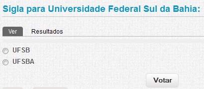 A comissão de implantação da universidade sul-baiana, que desde o início defende o uso da sigla Ufsba (sem o E), decidiu promover enquete na página da instituição. Por lá, a Ufesba, como foi aprovada no Congresso Nacional e sancionada pela presidente Dilma Rousseff não é opção. Figuram apenas Ufsba e UFSB. A argumentação é de que a definição Ufesba assemelha-se à de um projeto de criação da Universidade Federal doExtremo-Sul da Bahia. (do Pimenta)