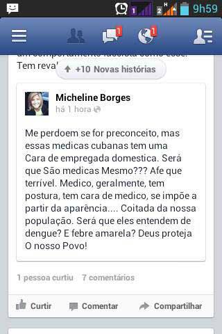 A foto acima diz tudo; um médico cubano negro, que chegou ao Brasil para trabalhar em um dos 701 municípios que não atraíram o interesse de nenhum profissional brasileiro, foi hostilizado e vaiado por jovens médicas brasileiras; com quem a população fica: com quem se sacrifica e vai aos rincões para salvar vidas ou com uma classe que lhe nega apoio?