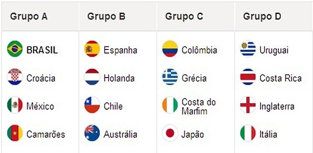 O Brasil faz parte do grupo A, ao lado de Croácia, México e Camarões. A possibilidade da formação de um grupo com até três campeões mundiais se confirmou e o grupo D terá Uruguai, Inglaterra e Itália e é considerado o mais difícil ao lado do grupo B, com Espanha, Holanda e Chile. O grupo mais fácil é o F, da Argentina, que tem ainda Bósnia-Herzegovina, Irã e Nigéria.