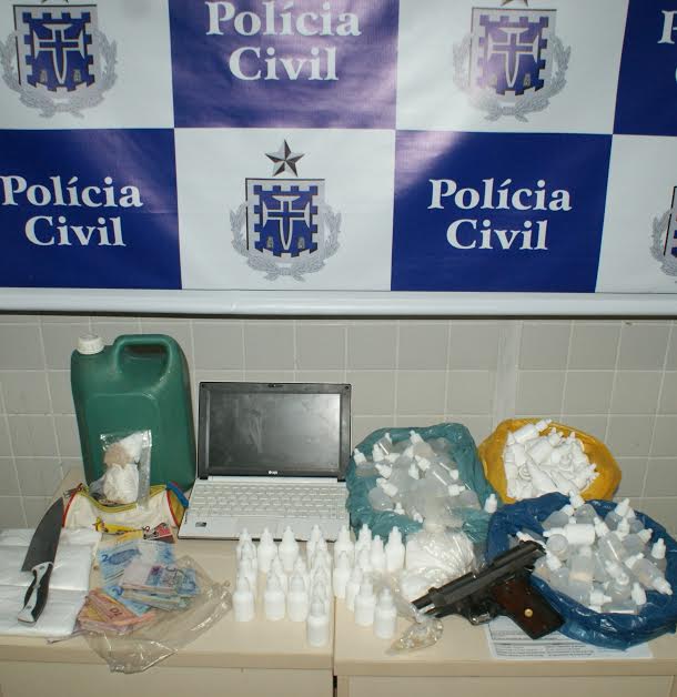 Na casa da traficante Tina Carla dos Santos Bezerra, de 36 anos, no Centro Histórico, os policiais encontraram o galão contendo a “Loló” e mais 178 frascos com a droga, prontos para venda, 21 “papelotes” de cocaína, três embalagens maiores contendo a mesma droga, 20 pedras pequenas de crack, mais uma pedra média e outra grande de crack, além de R$ 80 em dinheiro, um notebook e celulares.