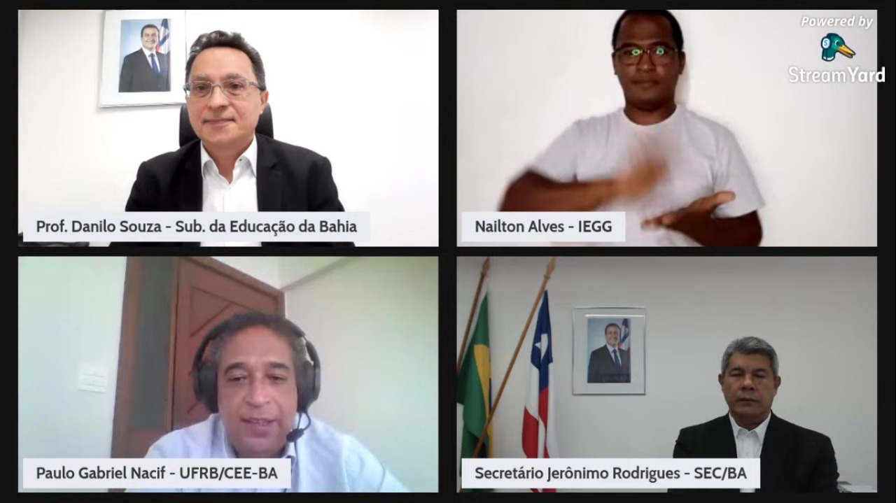 A sanitarista da Secretaria da Saúde do Estado da Bahia (SESAB), Cláudia Lima, juntamente com a superintendente de Recursos Humanos da Educação, Maria do Rosário Muricy, abordou sobre o projeto Escolas Seguras, que será realizado em parceria com a SEC. Já o professor Naomar Almeida Filho, que atua na Universidade Federal da Bahia (UFBA) e na Universidade de São Paulo (USP), abordou o tema “Pandemia da Covid-19 – Panorama da saúde, cuidado e prevenção na Educação”.