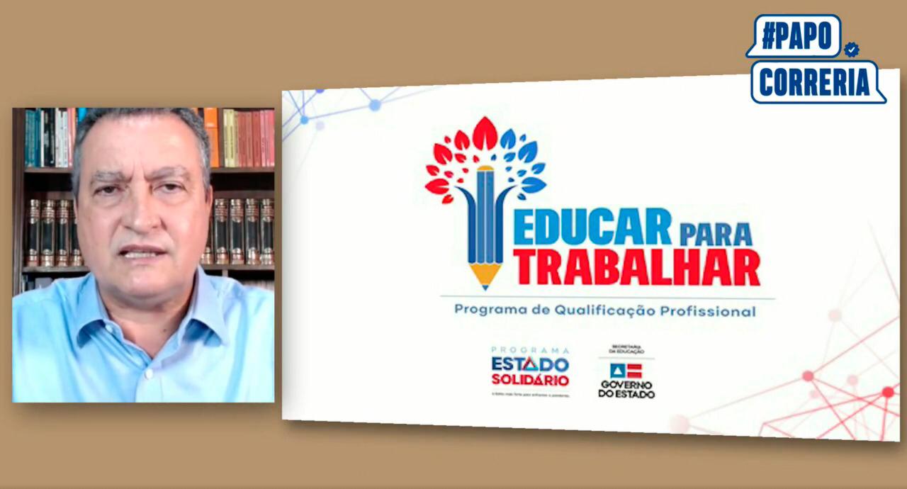 O governador Rui Costa lançou, durante a edição desta terça-feira (30) do Papo Correria, o Programa Educar Para Trabalhar – Programa de Qualificação Profissional, como parte do pacote de ações voltadas aos estudantes da rede estadual de ensino, no âmbito do programa Estado Solidário. Com o programa Educar Para Trabalhar, o Governo do Estado ofertará 200 mil novas vagas para 44 cursos gratuitos de qualificação profissional à distância, em 2021, na rede estadual de ensino.