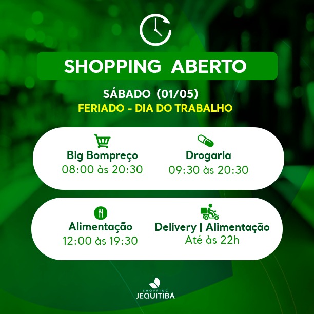 Em função de um acordo firmado entre o Sindicato dos Supermercados e Atacados do Estado da Bahia e o Sindicato dos Empregados do Comércio de Itabuna, o Bompreço do Shopping Jequitibá abrirá no sábado, dia 1º.de maio (Dia do Trabalhador) das 8;00 as 20;30 horas. Também estarão funcionando a Drogaria das 8;30 às 20;30 horas, a Praça de Alimentação das 12;00 às 19;30 horas e o serviço de delivery alimentação até as 22 horas.