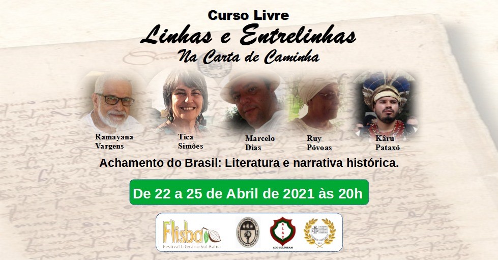 O Coletivo Flisba vai promover o “CURSO LIVRE: Linhas e Entrelinhas na Carta de Caminha” entre os dias 22 e 25 de abril de 2021. A atividade visa discutir a importância da Carta de Pero Vaz de Caminha sob uma ótica interdisciplinar, bem como refletir sobre o documento e seu potencial para a compreensão da atualidade brasileira.