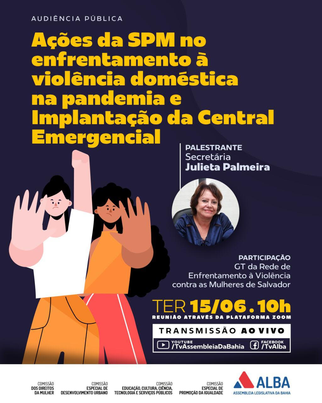 Ações da Secretaria estadual de Políticas para Mulheres (SPM) no Enfrentamento à Violência Doméstica durante a Pandemia e a implantação da Central Emergencial de Atenção às Mulheres serão apresentadas virtualmente em Audiência Pública, nesta terça-feira (15), às 10h, com palestra da secretária da SPM, Julieta Palmeira e participação do GT da Rede de Enfrentamento à Violência contra as Mulheres de Salvador.
