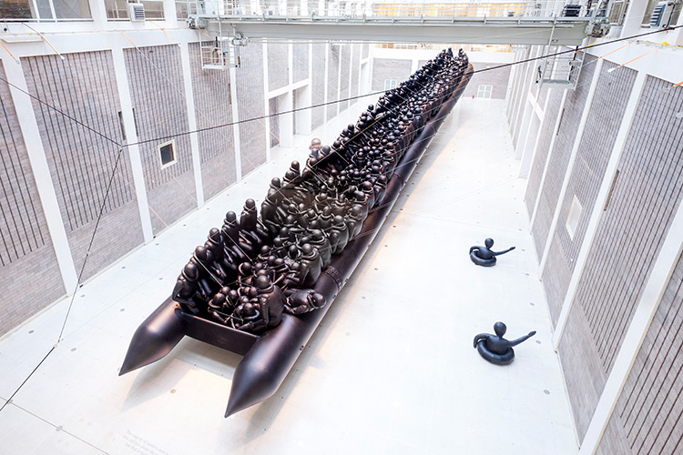 O chinês Ai Weiwei (1957), na exposição “Law of the Journey”, realizada na National Gallery Prague, na República Tcheca, apresenta uma imagem de alto impacto sobre a crise mundial dos refugiados. Coloca então mais de 300 bonecos infláveis em um grande bote salva-vidas, alusão aos que abrigam aquele que se arriscam no alto mar em busca de uma vida melhor.