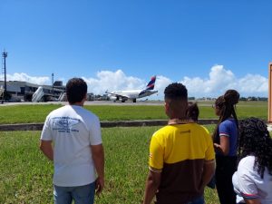 Os estudantes observaram a dinâmica do Aeroporto de Ilhéus do pouso de uma aeronave e toda a operação que ocorre em solo que vai desde limpeza até a vistoria preventiva da aeronave, ações que permitem a decolagem segura do avião para o seu novo destino.