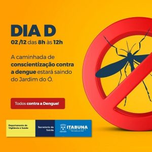 A Prefeitura de Itabuna promoverá ação de conscientização contra a dengue nesta sexta-feira, dia 2, das 8 às 12 horas. A mobilização pela Divisão de Endemias da Secretaria Municipal de Saúde acontecerá na Avenida do Cinquentenário, com saída do Jardim do Ó, integrando o cronograma de atuação dos Agentes de Combate às Endemias (ACE).