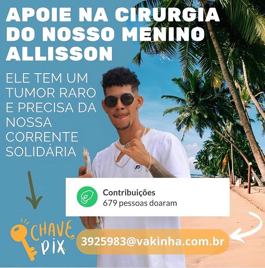 Allison Axel, morador de Ilhéus e ex- aluno do Curso Técnico em Guia de Turismo do CEEP Nelson Schaun, está precisando de apoio para tratar um tumor raro em São Paulo. Em 2019 ele fez radioterapia em Salvador, cumpriu todo o tratamento, no entanto agora ele foi diagnosticado com esse tumor, cujo tratamento é feito pelo Dr. Pedro Paulo Mariani, um dos maiores especialistas do Pais.