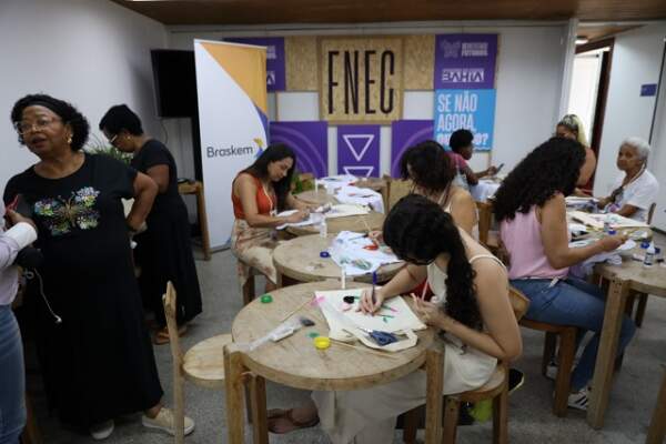 Dentre as atividades realizadas no MAC, neste primeiro dia de evento, o workshop “Economia Circular: um mundo de oportunidades”, liderado por Diva Oliveira, que comanda o projeto Mosaico Reciclado há 20 anos, dividiu com os participantes da oficina sua experiência na reciclagem de resíduos de garrafas PET para produção de quadros e estilização de camisetas.