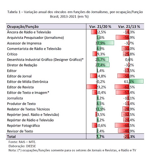 Observando o movimento entre 2020 e 2021, oito ocupações/funções sofreram redução do número de vínculos: Âncora de Rádio e Televisão; Crítico; Editor de Jornal; Editor de Mídia Eletrônica; Editor de Revista; Editor de Texto e Imagem; Repórter (exceto Rádio e TV); e Repórter Fotográfico.