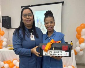 A entrega dos itens aconteceu durante a confraternização de despedida do estágio, no auditório da unidade hospitalar, na presença de profissionais de Enfermagem. A cadeira foi destinada para a enfermaria B, enquanto a maleta de transportes ao Pronto-Socorro.