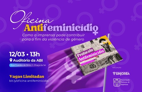 O Sindicato dos Jornalistas Profissionais da Bahia (Sinjorba) e a Associação Bahiana de Imprensa (ABI) realizam, no dia 12 de março, a oficina “Protocolo Antifeminicídio – Guia de Boas Práticas para a Cobertura Jornalística”, voltada à qualificação da cobertura da violência de gênero na imprensa.