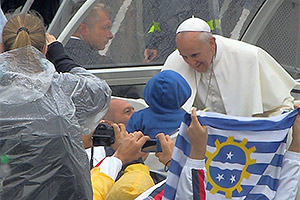 O papa Francisco desembarcou por volta das 10h10 e desfila no papamóvel pelas ruas da cidade. Depois, se dirige para a Capela dos Apóstolos, localizada atrás da imagem de Nossa Senhora Aparecida. No local, faz uma pequena oração acompanhado de sacerdotes redentoristas e diocesanos, além da comitiva papal.