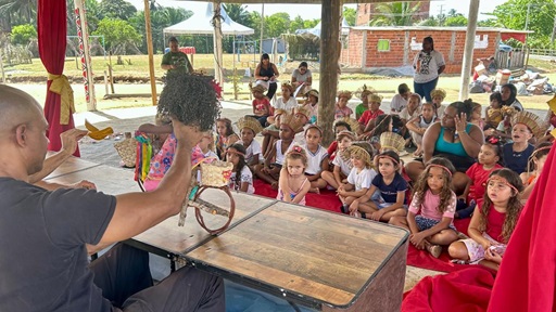 O projeto A Aventura de Mariá e Mureci Circulação Primeira Infância deu início à sua temporada em Ilhéus com duas apresentações muito especiais em creches municipais indígenas de Olivença. Na segunda-feira (22), a Creche Tupinambá Oka Katuana recebeu o espetáculo, e hoje (23) foi a vez da Creche Amotara. Em cada unidade escolar foram realizadas quatro sessões, contemplando turmas diferentes e reunindo cerca de 200 crianças no total.