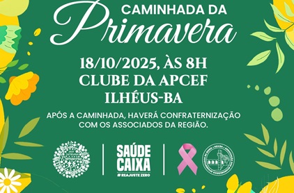 A Associação dos Economiários Aposentados da Bahia- AEA BA, em parceria com a APCEF-Ilhéus, promoverá no próximo dia 18 de outubro, a Caminhada da Primavera, proporcionando uma confraternização dos associados de Ilhéus/Itabuna e região.