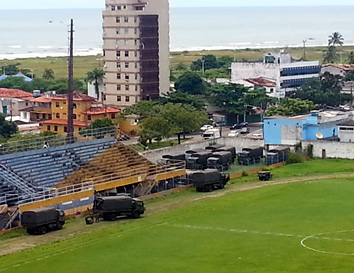 Pelo menos quinze caminhões do exército se encontram dentro do estádio Mário Pessoa, em Ilhéus. Os veículos estão à diposição de tropas que chegaram à cidade ontem (quarta, 12), em um avião Hércules C130.