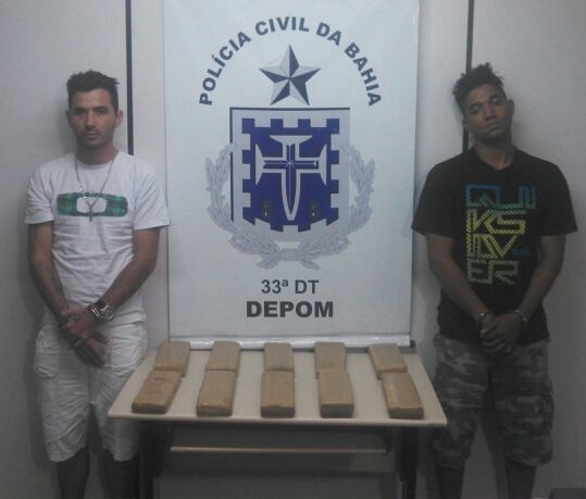 Dez quilos de maconha prensada, distribuídos em dez tabletes, foram apreendidos com os traficantes paulistas Robson Oliveira da Silva, de 26 anos, e Edebson Alves de Medeiros, 32, na quinta-feira (12), por equipes das polícias Civil e Militar, em Monte Gordo. Eles estavam a bordo de um táxi transportando a droga, acondicionada em um saco plástico dentro de uma mala, da cidade de Entre Rios para Barra do Jacuípe, no Litoral Norte.