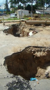 Crateras abertas na avenida Amélia Amado, centro de Itabuna, obra mal feita que Azevedo inaugurou sem estar concluída. Ao fundo, a placa que, após as enchentes no local e a abertura das crateras que provocaram a interdição da pista foi parcialmente arrancada por um popular indignado com tamanha desfaçatez.