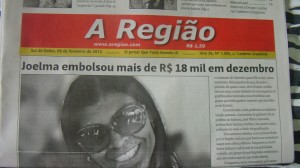 Manchete de capa do jornal A Região desta semana, revelando que no ultimo mês do governo Azevedo a secretária Joelma Reis engordou o próprio salário e recebeu R$ 18 mil, enquanto centenas de servidores ficaram até três meses sem receber salários.