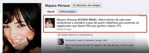 Por outro lado, a estudante, que confessou a publicação do conteúdo, disse que escreveu a mensagem após a vitória da presidente Dilma Rousseff (PT) nas eleições presidenciais de 2010. Porém, Mayara disse à Justiça que não é preconceituosa e não teve a intenção de ofender os nordestinos. Mesmo assim, em consequência do ato, a universitária perdeu o emprego (estágio) e abandonou a faculdade, além de ter mudado de cidade com medo de sofrer retaliações.