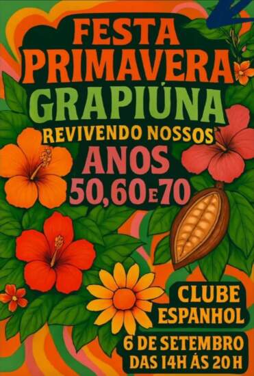Será realizada no próximo dia 6 de setembro, no Clube Espanhol, em Salvador, a Festa Primavera Grapiúna, com o tema “Revivendo os nossos anos 50, 60 e 70”.
