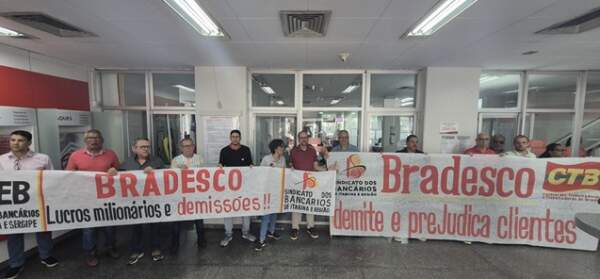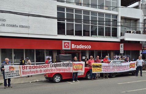 O Sindicato dos Bancários de Itabuna realizou na manhã desta terça-feira, 12, um ato com paralisação na unidade do banco, que segue até o meio-dia, dentro das mobilizações do Dia Nacional de Luta contra as Demissões no Bradesco. A mobilização denuncia o fechamento de agências e postos de atendimento, além das demissões promovidas pela instituição.