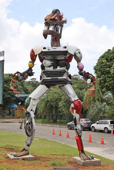 O Departamento Estadual de Trânsito da Bahia (Detran-BA) apresentou uma instalação artística inovadora como parte de suas ações para conscientizar os motoristas sobre a importância de seguir as condutas adequadas no trânsito. O totem gigante, com seis metros de altura e peso de 800 kg, foi construído com sucatas de veículos e é uma criação do artista plástico Silvio Roberto Andrade. Esta obra de arte, que faz parte da campanha ‘Não seja um Monstro no Trânsito’, está localizada no canteiro do antigo Bahia Café Hall, às margens da movimentada Avenida Luís Viana Filho, mais conhecida como Av. Paralela, sendo visível para todos que passam na região no sentido Aeroporto.