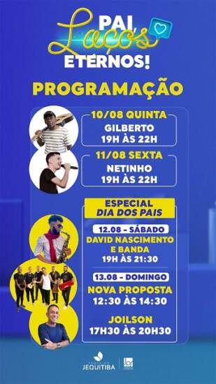 A programação musical começa na quinta, dia 10, e vai até domingo, quando se celebre o Dia dos Pais. Na abertura, o cantor Gilberto se apresenta das 19 às 22 horas no piso superior, com um repertório intimista de músicas da MPB, proporcionando uma atmosfera acolhedora e nostálgica. Na sexta, quem se apresenta é Netinho Alcantara, trazendo um repertório mais arrojado e jovial.