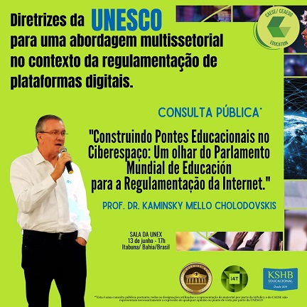 A consulta pública terá palestra do professor Dr. Kaminsky Mello Cholodovskis Geral da UNEX e Sócio Diretor da KSHB Educacional e Director General Parlamentario Mundial en Brasil.