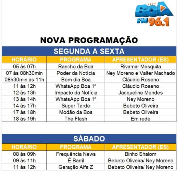 A estreia da nova programação, desde sábado, 04 de outubro, tornou-se um marco na história da Boa FM, no sul da Bahia. Com o início da grade local, neste dia, grandes passos foram dados, objetivando a aproximação da marca junto ao público adolescente e jovem adulto, e os ajustes na grade de segunda a sexta-feira buscam estreitar relações com as pessoas das classes A e B, a partir dos 30 anos, sem deixar de lado seu público fiel, que a coloca na liderança como a rádio mais ouvida na região do sul-baiano, segundo relatório radios.com.br, no período de setembro/2025.