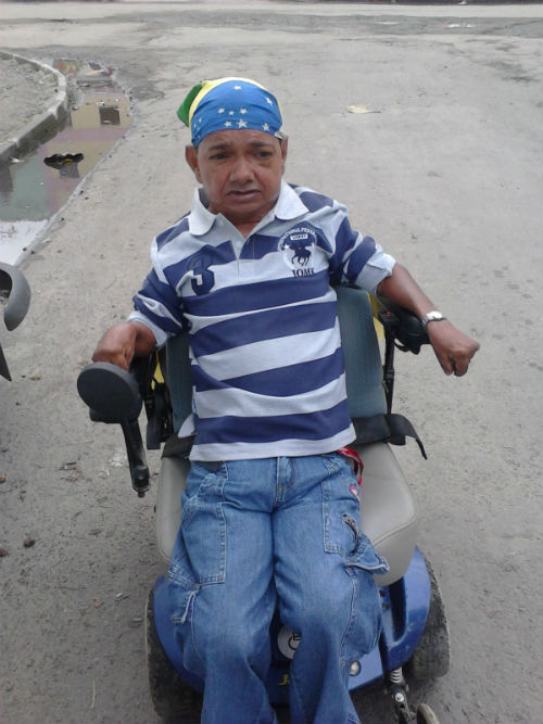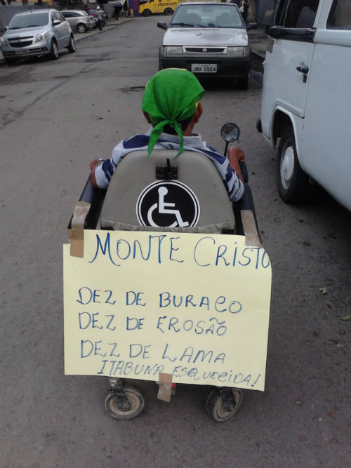 Nei utilizou sua cadeira de rodas para exibir um cartaz cobrando melhorias no bairro e exigindo uma ação efetiva das autoridades.