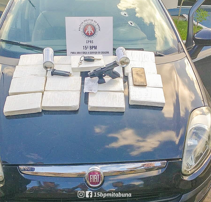 Após denúncias de pichações com siglas de uma organização criminosa, guarnições do 15° Batalhão da Polícia Militar (BPM) apreenderam 19 tabletes de cocaína, uma pistola calibre 380 e um veículo modelo Punto, após confronto com um homem, no bairro de São Roque, município de Itabuna.