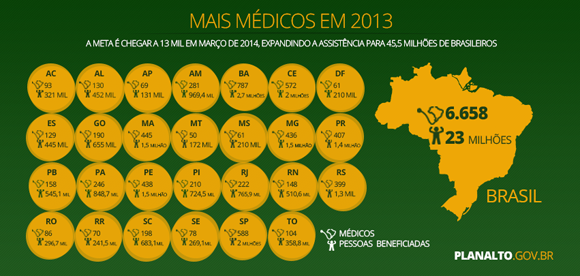 “O Mais Médicos já levou 6.658 médicos para milhares de municípios de todo o país. Esses profissionais estão garantindo o atendimento a cerca de 23 milhões de brasileiras e brasileiros. Veja só, 23 milhões de pessoas que passaram a contar com o médico em suas cidades e, em muitos casos, até no bairro onde moram. O Mais Médicos é uma resposta do governo federal às necessidades da população, que sempre reivindicou a melhoria da saúde em nosso país”, afirmou Dilma.