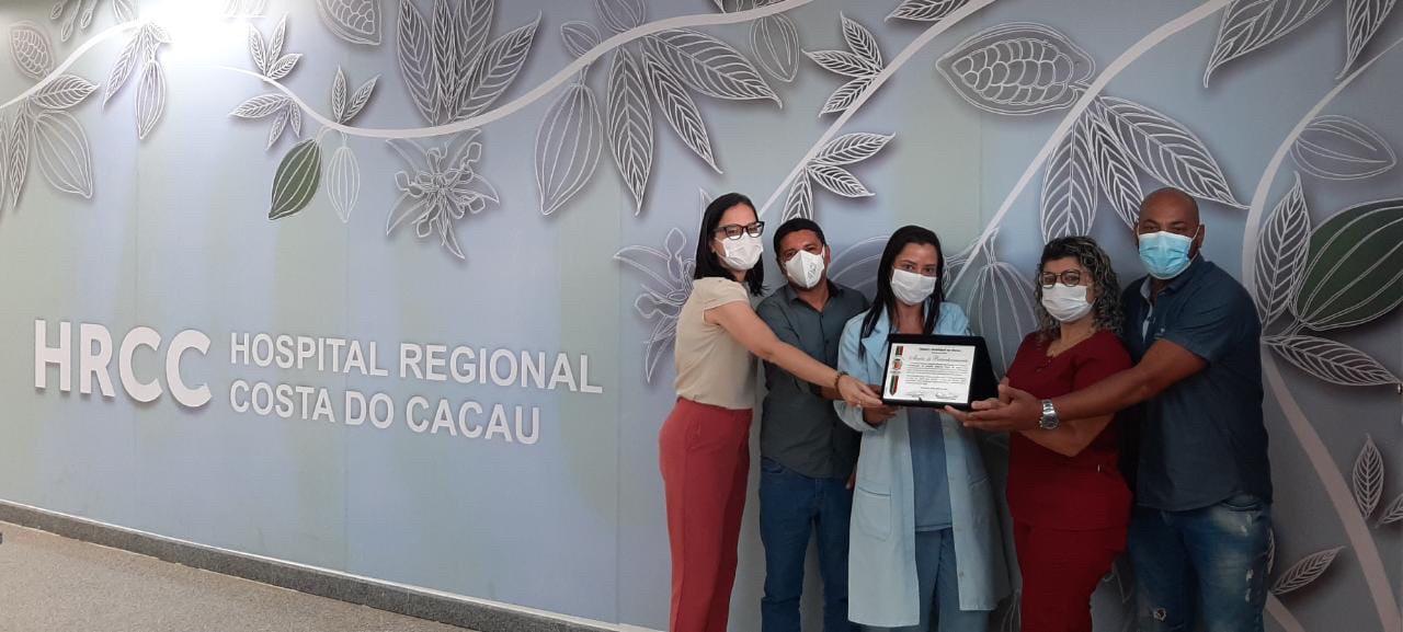 Reconhecido pelo trabalho e desempenho de seus profissionais na assistência aos pacientes acometidos pela Covid-19, o Hospital Regional Costa do Cacau (HRCC), em Ilhéus, recebeu uma placa em homenagem aos serviços prestados pelo combate à pandemia do novo coronavírus no interior da Bahia. A condecoração foi entregue pela Câmara de Vereadores de Ilhéus, representada pelo vereador Fabrício Nascimento, vice-presidente da casa legislativa, na última terça-feira (04).