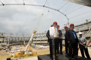 Depois de um sobrevôo de helicóptero pela Arena Fonte Nova, a comitiva foi para o centro do estádio de carro e ao descer para uma visita in loco, todos e, em especial, Ronaldo Fenômeno, foram recebidos com muita festa pelos operários da obra. Aos gritos, os funcionários afirmavam para o ex-jogador que o estádio ficará pronto no dia 30 de dezembro deste ano.