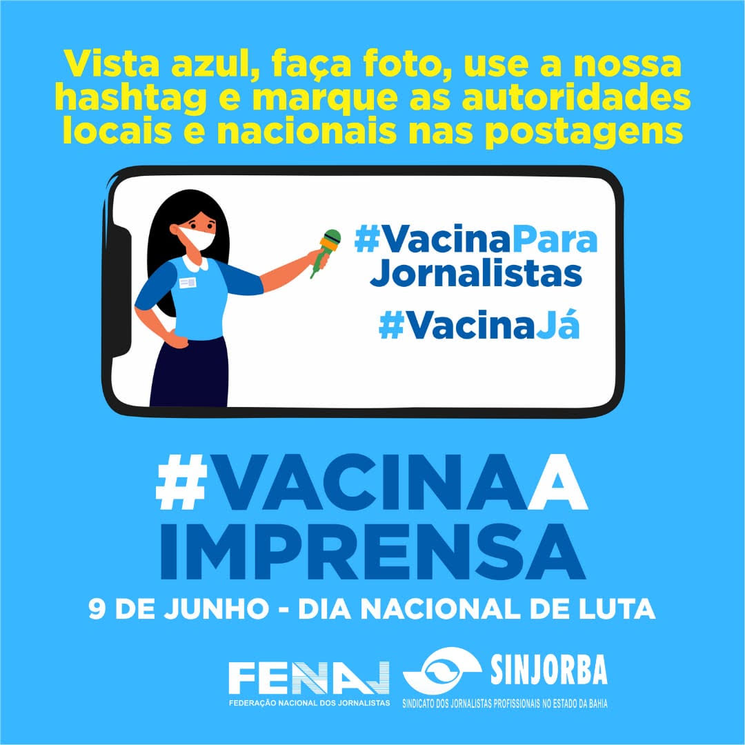 A Federação Nacional dos Jornalistas (FENAJ) e os Sindicatos da categoria em todo o Brasil promovem, nesta quarta-feira (9/06), o Dia Nacional de Luta pela Vacinação dos Jornalistas. O objetivo é reforçar as ações pela inclusão dos profissionais da mídia entre os grupos prioritários de imunização contra a Covid-19, uma vez que os operários e operárias da notícia estão na linha de frente, cobrindo a pandemia do coronavírus.