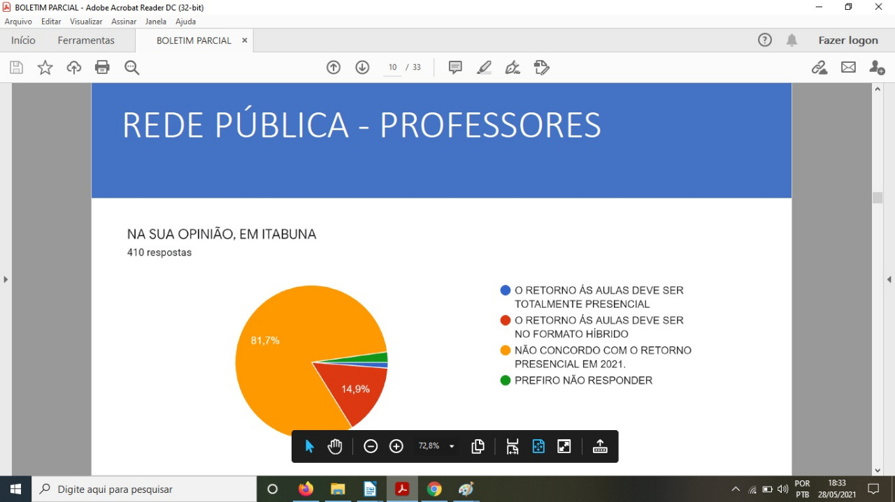 A Consulta, efetuada por meio virtual, revelou ainda que 23,3% da comunidade em geral concordam que as aulas sejam ministradas no formato híbrido. Já no segmento dos professores que atuam nas escolas da Rede Pública Municipal, 86,6% reprovaram o retorno às aulas presenciais, bem como 89,8% deles disseram não se sentir seguros em lecionar com tal possibilidade.