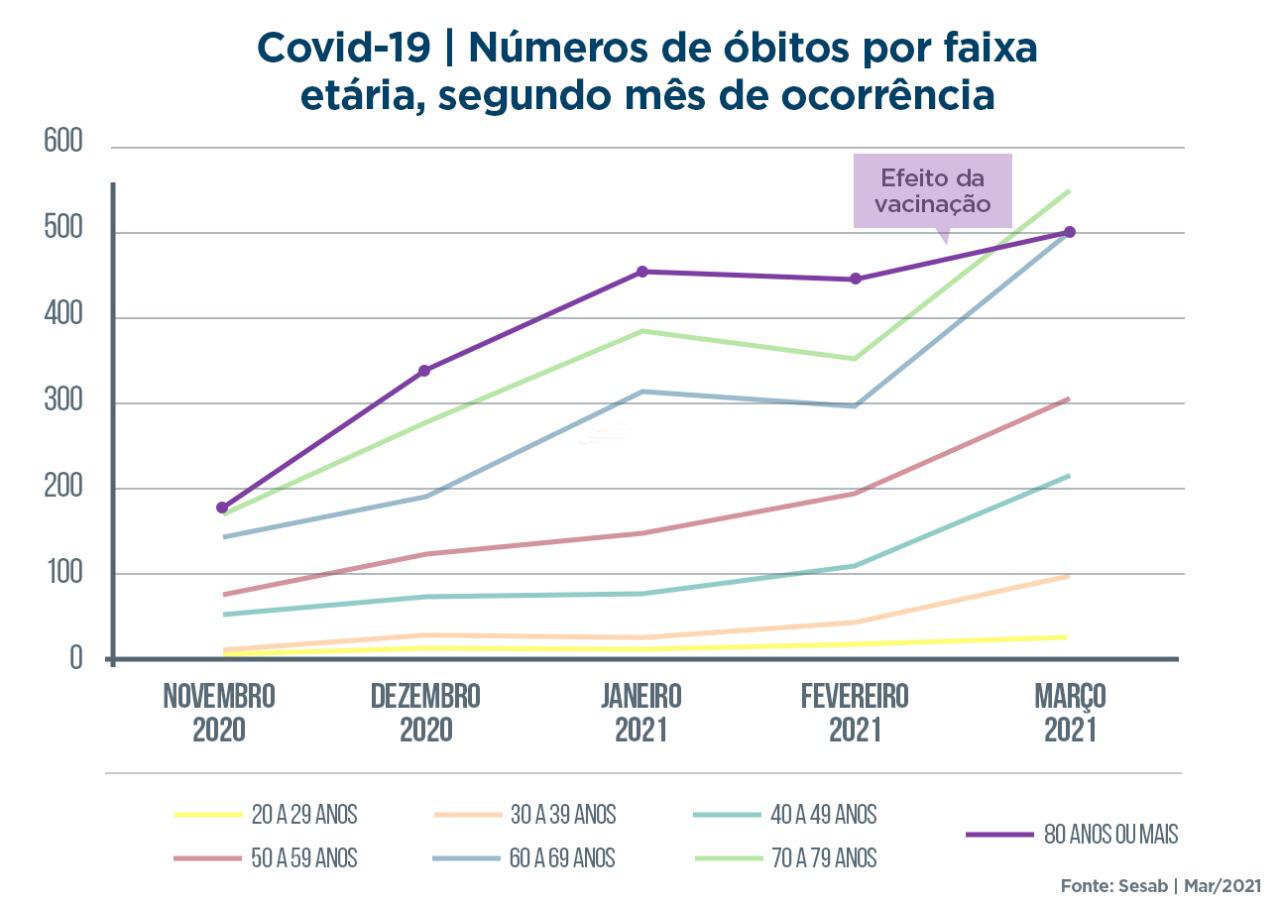 Sozinha, a faixa etária de 30 a 39 anos teve um incremento de 553% no comparativo das mortes ocorridas em novembro de 2020 e março de 2021. Já os jovens entre 20 e 29 anos tiveram um aumento de 250% no mesmo período.