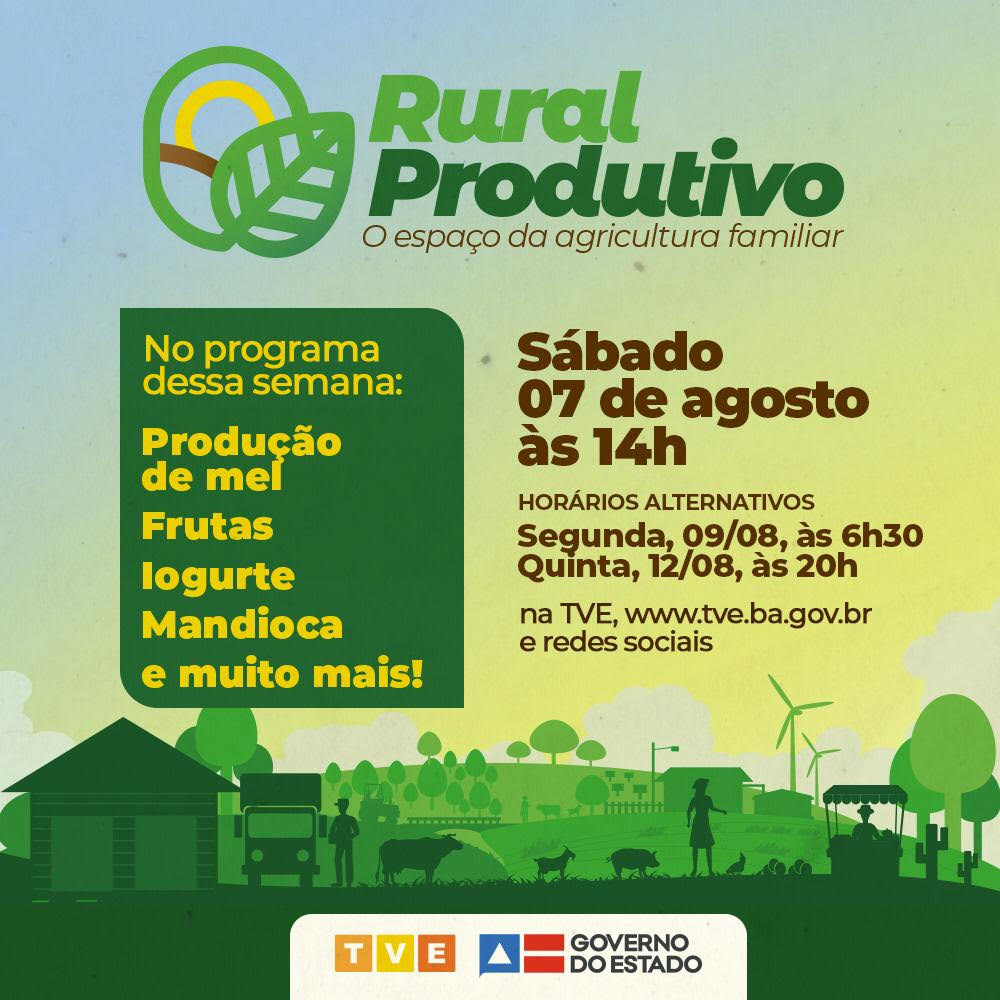 Neste sábado (5), o Rural Produtivo da TVE destaca a formação de jovens agricultores na Casa Familiar Rural em Presidente Tancredo Neves. E ainda traz a retomada das feiras livres e agroecológicas com as orientações da “Campanha Viva a Feira & Feira Segura” e visita uma horta orgânica em Juazeiro. Outro destaque é o início da 11ª Feira Baiana da Agricultura Familiar e Economia Solidária, que neste ano acontece on-line no www.feiradaagriculturafamiliar.com.br. Aos sábados às 14h, o programa tem horário alternativo na segunda-feira, às 6h30, e na quinta-feira, às 20h.
