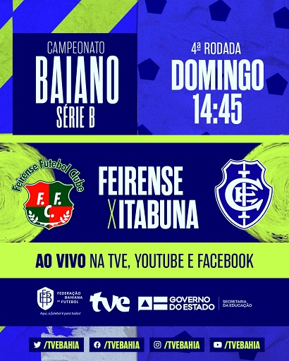 Neste domingo (05) a TVE transmite a partir das 14h45 (pré-jogo), a partida entre Feirense e Itabuna pela 4ª rodada da série B do Campeonato Baiano. A disputa acontece no Estádio Municipal José Trindade Lobo, mais conhecido como Lobão, em Santo Antônio de Jesus, e os torcedores poderão também assistir ao confronto pelo Youtube.com/tvebahia e Facebook.com/tvebahia.