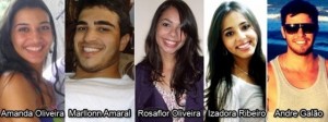 Estavam desaparecidos André Galão, 28, ex-estudante de design de moda do Centro Universitário do Espírito Santo (Unesc), Izadora Ribeiro, 21, Rosaflor Oliveira, 24, Amanda Oliveira, 22, e Marllonn Amaral, 21 –todos estudantes de biologia do Centro Universitário Norte do Espírito Santo (Ceunes). A polícia trabalha com a hipótese de acidente, mas não descarta a hipótese de homicídios motivados por vingança.